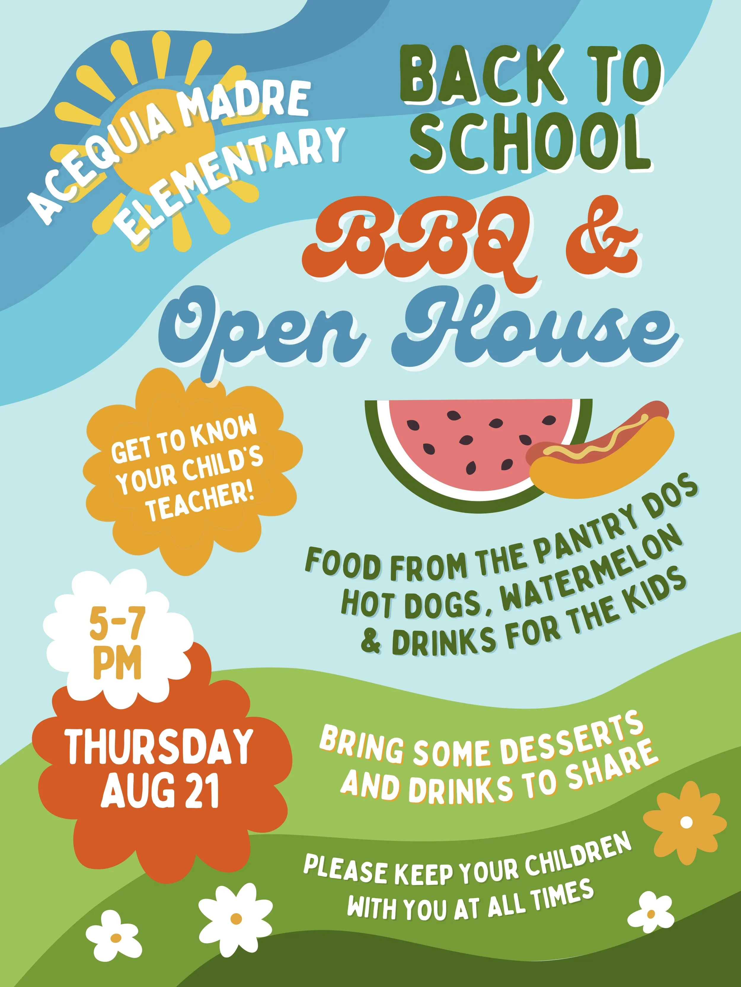 Join us for our annual back to school BBQ and Open House! This is a great chance to get to know your community, meet your child’s teacher and have fun. We will have enchiladas, beans, posole and salad from The Pantry as well as hot dogs for the kids. Parents are encouraged to bring deserts and drinks!